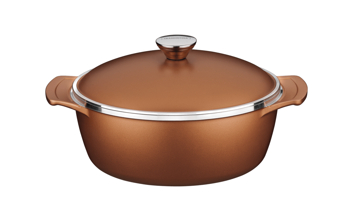 La cacerola Tramontina Lyon de aluminio forjado con revestimiento interno antiadherente Starflon High Performance con tapa dorada 24 cm de diámetro 3,7 L de la línea Lyon presenta una belleza Única. Su color dorado proporciona modernidad, elegancia y sofisticación en todas las ocasiones. Una pieza de deseo, siendo un horno sobre el fogón y que además de todo es funcional y de alta calidad. Fabricada en aluminio forjado con revestimiento interno y externo de antoadherente Starflon High Performance que cuenta con la tecnología T, otorga más antiadherencia, más resistencia a la abrasión, más durabilidad, es exenta de PFOA y es más fácil de limpiar. El pomo de acero inoxidable trae un detalle todavía más bonito, característica exclusiva de la línea Lyon.
